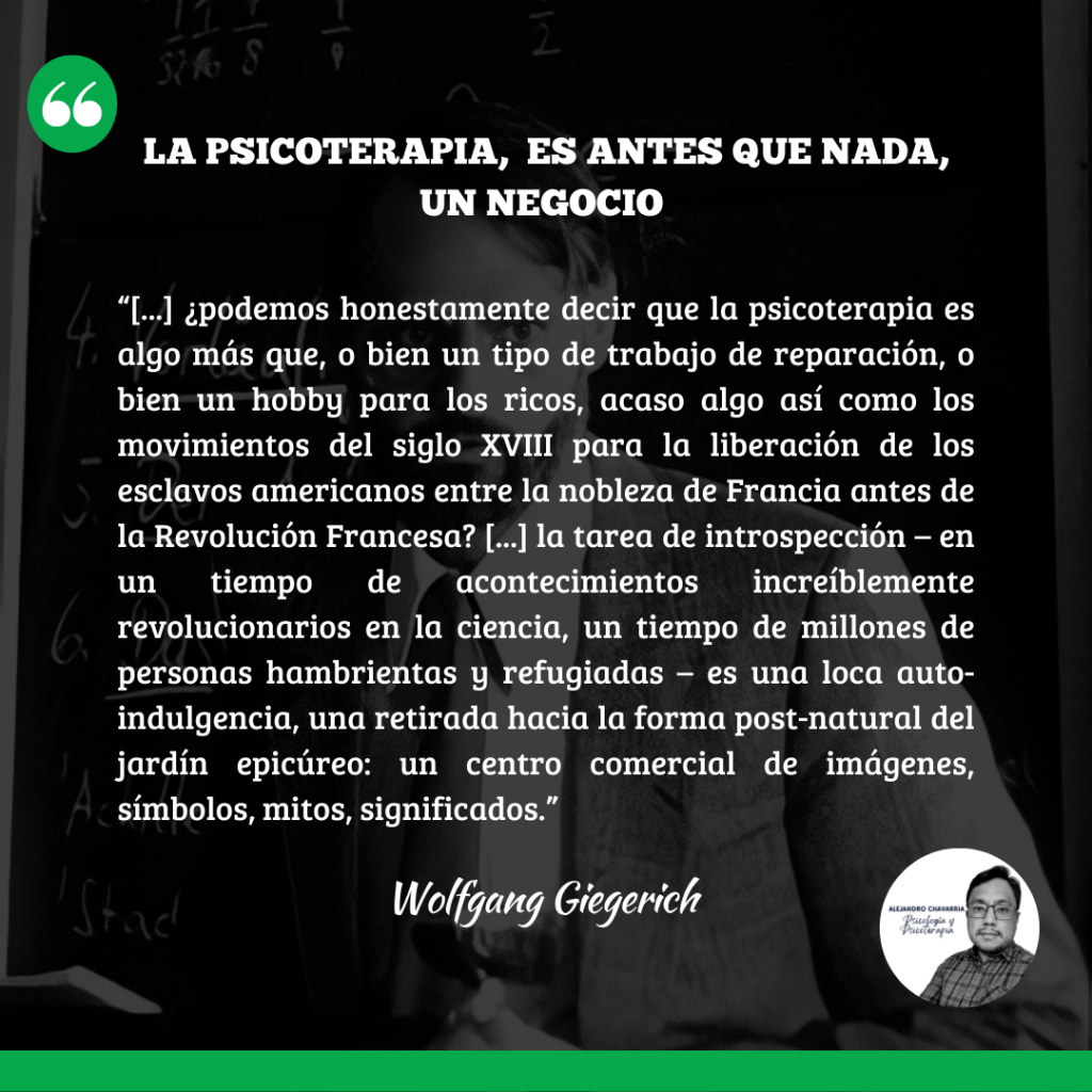 Solo por medio del autoengaño los psicoterapeutas podemos adornar la labor terapéutica como la búsqueda del verdadero ser, de la individuación o del bienestar del paciente y observar el espacio terapéutico como un antiguo y sagrado temenos. Lo cierto es que la psicoterapia es, antes que nada, un negocio que vende un producto especifico: la narrativa posmoderna del sujeto como objeto de mercado o la búsqueda del significado, que no es sino un escape, entre tantos, de la consciencia de la inanidad del hombre que vaga desnudo por su propia existencia.
