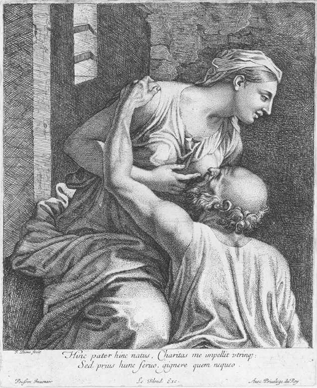 Quiero hablarles de una imagen muy clásica del anciano: el melancólico anciano del cuento de la Caridad Romana (caritas romana) o Cimón y Pero. Fue pintado por muchos artistas durante el Renacimiento y después. Es la imagen de un anciano encerrado en una celda. Está en un calabozo y entra un poco de luz desde arriba, y su hija lo visita y le da su leche materna. Esa es una metáfora, una metáfora muy poderosa de la depresión que cautivó la imaginación de los pintores renacentistas y también de los holandeses. Imaginen que este anciano está en cada persona: viejo, deprimido, inmóvil, encerrado en un sistema, encerrado en hábitos, encerrado en prejuicios, encerrado en sistemas de creencias que se han convertido en prejuicios. Hace frío, hay humedad y está oscuro en ese mundo. Ahora bien, ¿qué entra para dar leche? Se suponía que esto era algo que las jóvenes matronas romanas debían hacer: visitar a las prisioneras.